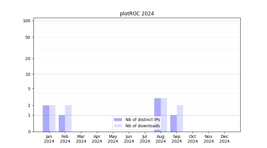 Number of downloads for workflow package plotROC, year by year, from 2025 back to 2015 (years with no downloads are omitted):